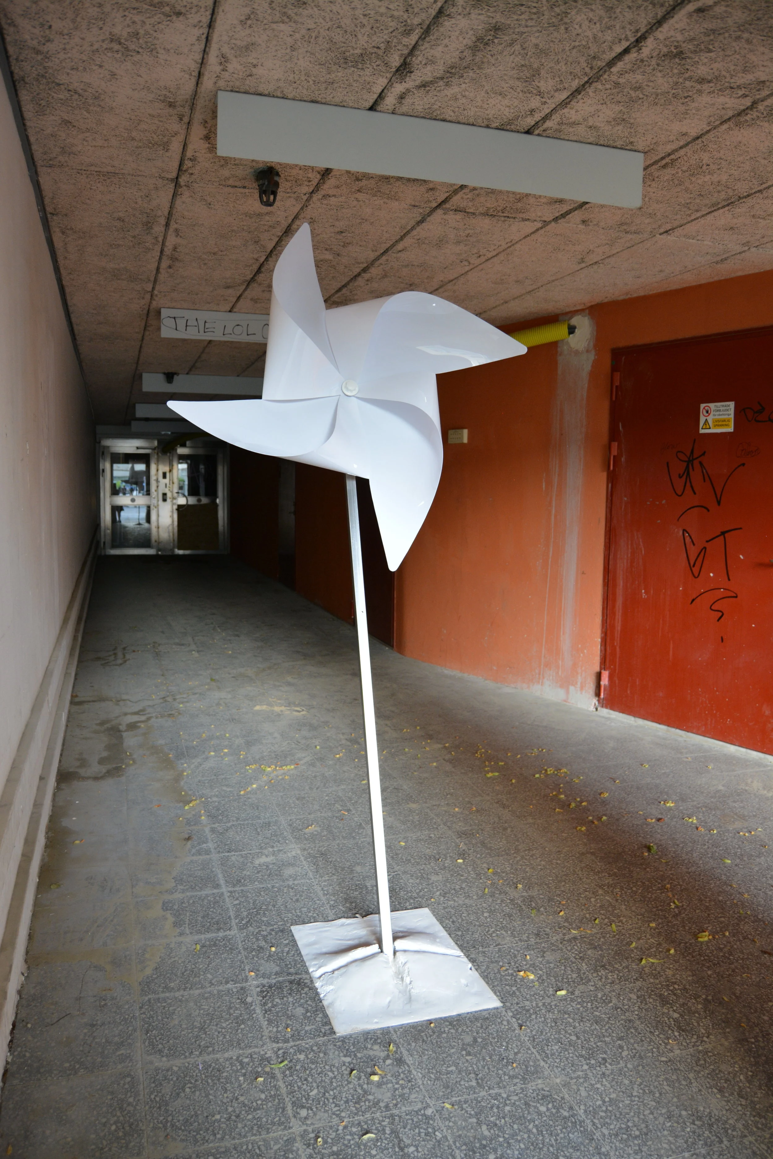 Rotating wind sculpture with sign reading: 59°30’05.2”N 17°99’33.4”E - Facing east, you are travelling at an approximate speed of 860 km/h around the center axis of the earth